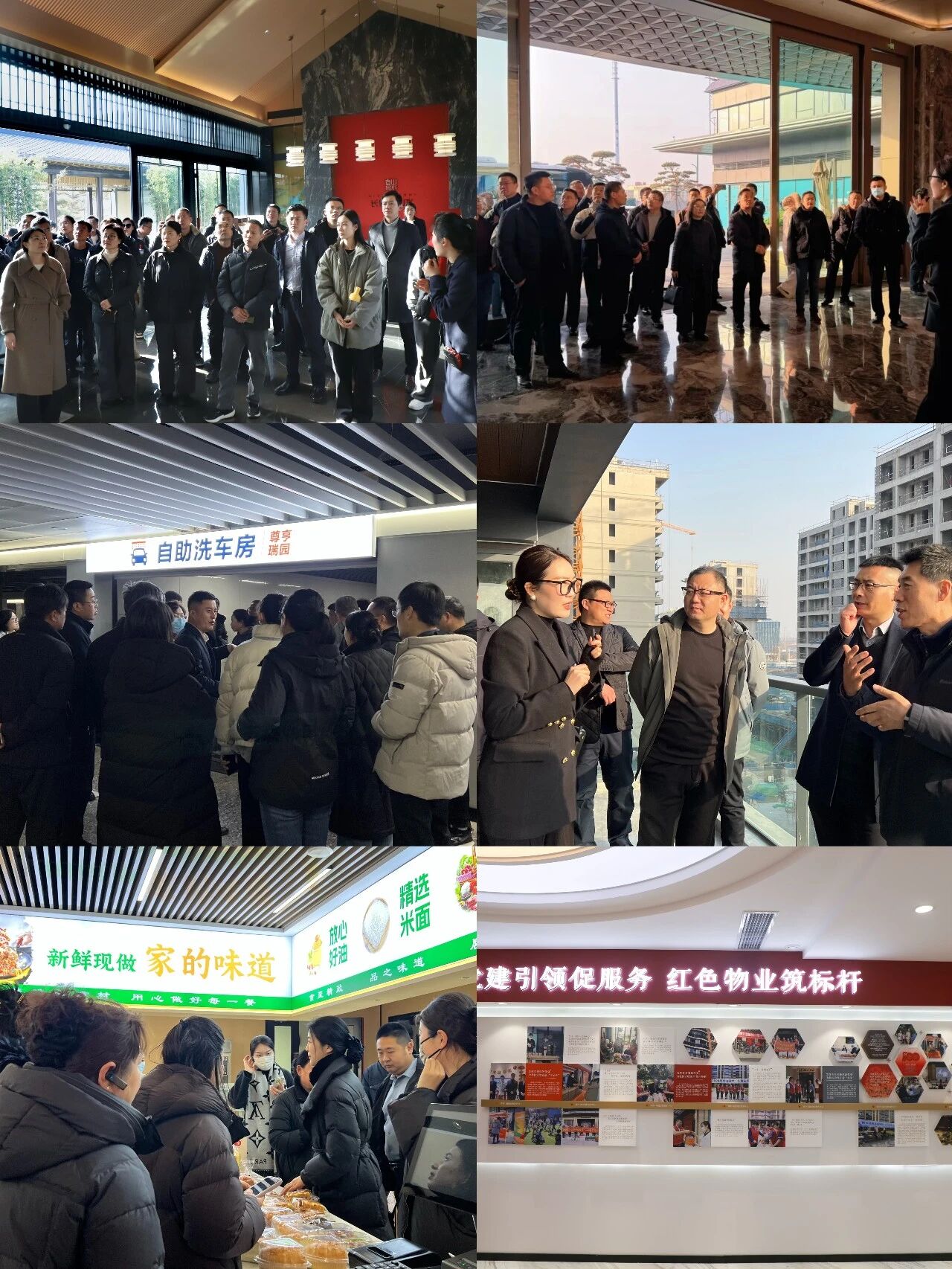 在浩璟学府项目,观摩团一行现场观摩了小区绿化景观、健身中心、图书馆、业主食堂、洗车房及智慧物业服务中心等十余处配套设施,详细听取项目在物业服务、社区运营等方面的系统介绍。